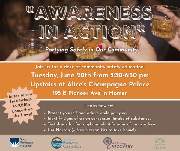 Join Annie Garay, Community Health and Wellness Educator from South Peninsula Hospital, and Robin Holmes, MD from Kachemak Bay Family Planning for “Awareness in Action”, a free one-hour workshop on how to party safely in social environments. Learn to identify signs of non-consensual substance intake, test drugs for fentanyl, and identify signs of an overdose. Learn overdose response techniques and get a free Narcan kit. This event will be held Tuesday, June 20th from 5:30-6:30pm at Alice’s Champagne Palace, 195 E Pioneer Ave. in Homer. Enjoy free pizza, non-alcoholic beverages and door prizes. For more information contact SPH Health & Wellness at 907-235-0285.