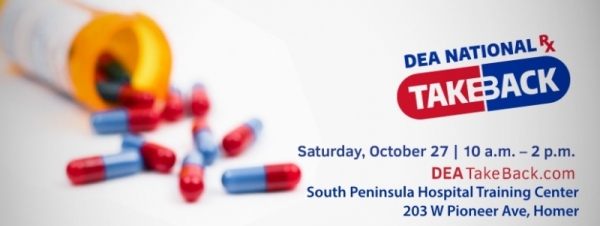 Saturday, October 27th from 10:00 AM - 2:00 PM is a National Prescription Drug Takeback Event sponsored by Change 4 the Kenai and South Peninsula Hospital at the South Peninsula Hospital Training Center in cooperation with the Homer Police Department! Bring your unused or expired prescription medicines to the SPH Training Center at 203 W Pioneer Avenue anytime between 10 AM - 2 PM to safely dispose of them and get a $5 coffee card and FREE medication disposal system bags for safe disposal at home!