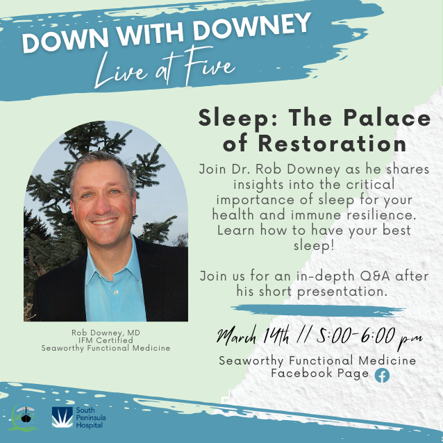 Join Dr. Rob Downey on the Seaworthy Functional Medicine Facebook Page on Thursday, March 14th at 5:00pm as he shares insights into the critical importance of sleep for your health and immune resilience. Learn how to have your best sleep! Join us for an in-depth Q&A after his short presentation.