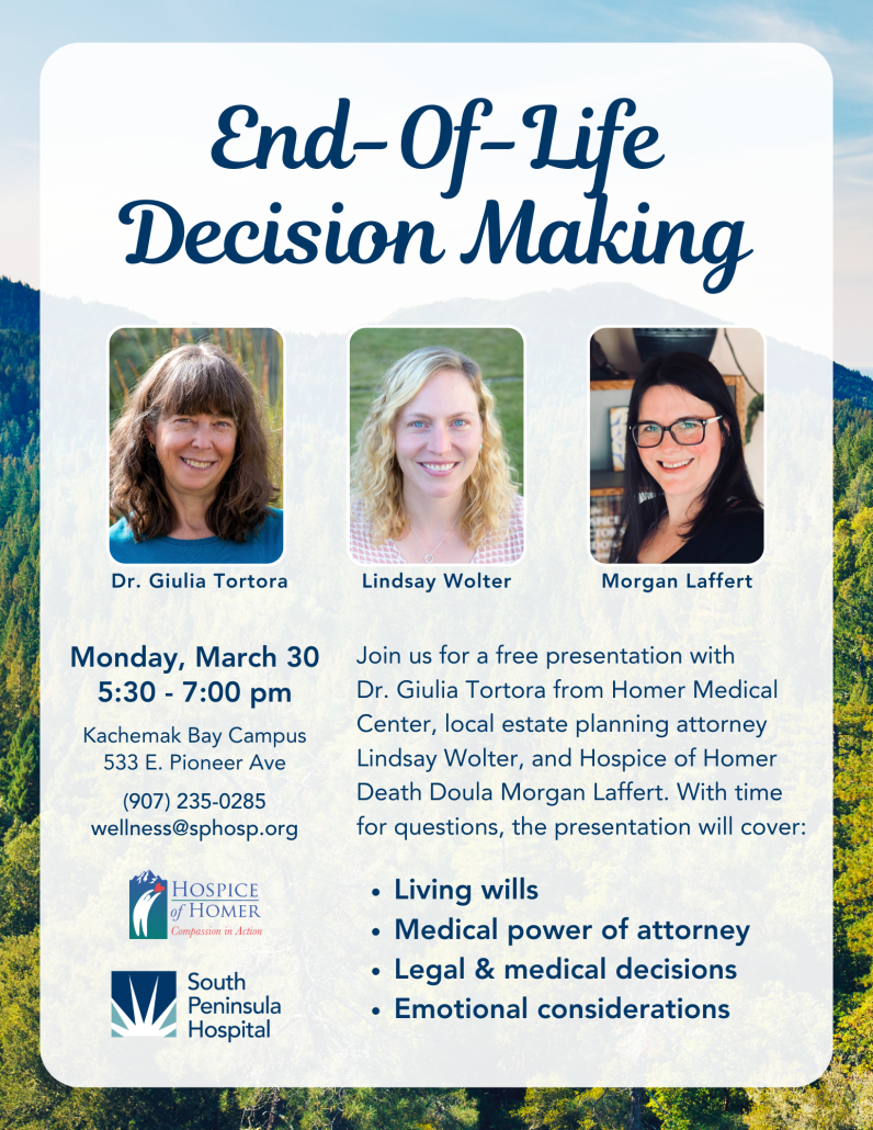 Join us for a free presentation with Dr. Giulia Tortora from Homer Medical Center, local estate planning attorney Lindsay Wolter, and Hospice of Homer Death Doula Morgan Laffert. With time for questions, the presentation will cover living wills, medical power of attorney, legal and medical decisions, and emotional considerations for end-of-life planning.