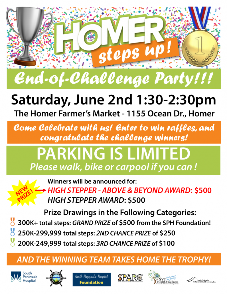 Join us at the Homer Farmers Market on Saturday, June 2nd from 1:30 - 2:30 PM for the End of Challenge Party for the Homer Steps Up 2018 Community Walking Challenge!