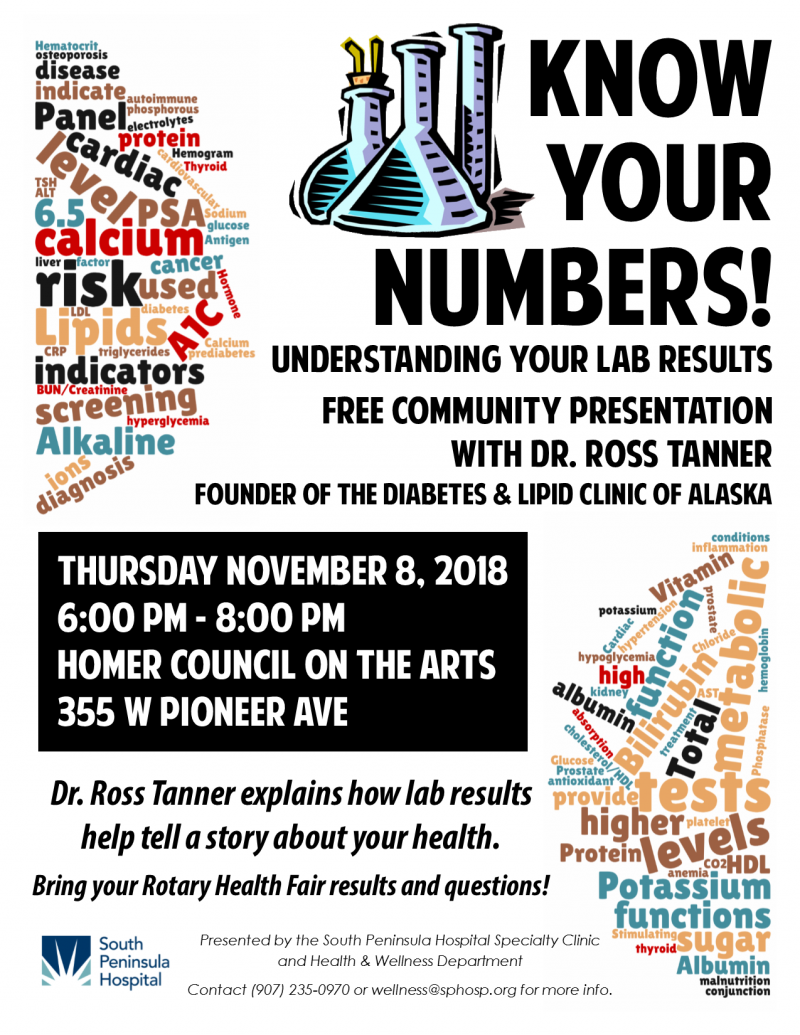 Join South Peninsula Hospital and Dr. Ross Tanner, founder of the Diabetes and Lipid Clinic of Alaska for a free evening presentation and Q&A on understanding your lab results at Homer Council on the Arts, 355 W Pioneer Ave in Homer, from 6 PM - 8PM on Thursday, November 8th. Bring your results from the Rotary Health Fair, or any other testing, and your questions! Contact SPH Health & Wellness for more information at (907) 235-0970