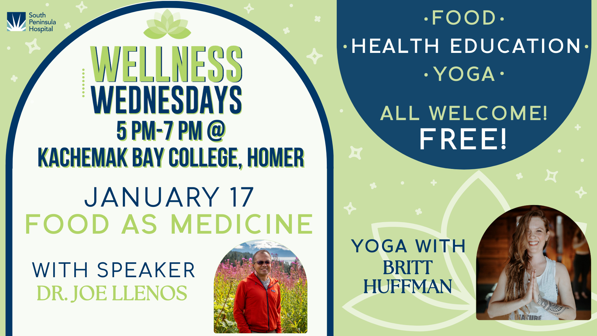 Join South Peninsula Hospital's Health and Wellness for Wellness Wednesday on January 17th from 5:00-7:00pm at Kachemak Bay Campus, Homer.