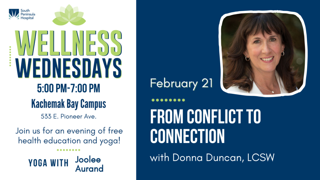 Join us for an evening with Donna Duncan, LCSW and Clinical Director at South Peninsula Behavioral Healthy Services. She will discuss strategies for transforming conflict to connection. A great skill to have in any relationship.