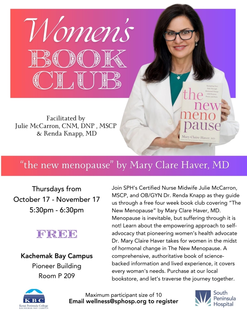 Join Certified Nurse Midwife Julie McCarron, MSCP, and OB/GYN Dr. Renda Knapp as they guide us through a free four-week book club covering “The New Menopause by Mary Clare Haver, MD”. Menopause is inevitable, but suffering through it is not! Learn about the empowering approach to self-advocacy that pioneering women’s health advocate Dr. Mary Claire Haver takes for women in the midst of hormonal change in The New Menopause. A comprehensive, authoritative book of science-backed information and lived experience, it covers every woman's needs. Purchase at our local bookstore, and let’s traverse the journey together! Max participant size of 10, email wellness@sphosp.org to register.